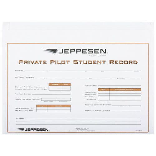 Private Pilot Record Folder from Jeppesen effectively allows private pilot students to track ground lessons, written exams, flight maneuvers, and flight checks during pilot training for FAR Part 141 and Part 61.