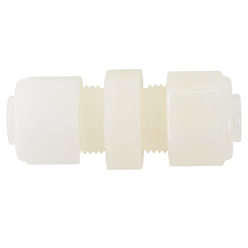 NYLO-Seal Nylon Tube Unions have excellent resistance to acids, alkalis, dilute mineral acids, most organic acids, petroleum oils and greases, and photographic solutions. Installation time is reduced with NYLO-Seal fittings when compared to regular compression or flare fittings. Also, stress on the tubing is relieved during installation as the nut revolves around the sleeve as it is being tightened, which prevents torque from being transmitted to the tubing, to provide an excellent seal and ensures reliability. NYLO-Seal Nut & Sleeves are made of molded nylon to be strong and resistant to abuse, and the acetal copolymer sleeves provide maximum performance. They can continuously operate at temperatures of 200°F and intermittently at temperature as high as 250°F. NYLO-Seal fittings are excellent for instrument, lubricant, air, hydrocarbon fuel, oil coolant, low pressure hydraulic lines, laboratory, and chemical applications.This NYLO-Seal tube union (EDMO# 262N05) fits 5/16-inch tubing.