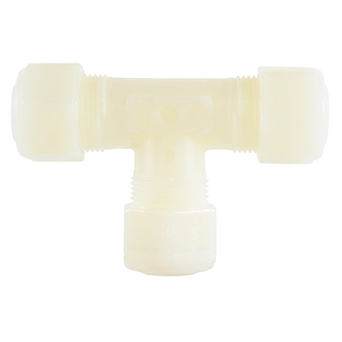 NYLO-Seal Nylon tube fittings have excellent resistance to acids, alkalis, dilute mineral acids, most organic acids, petroleum oils and greases, and photographic solutions. Installation time is reduced with NYLO-Seal fittings when compared to regular compression or flare fittings. Also, stress on the tubing is relieved during installation as the nut revolves around the sleeve as it is being tightened, which prevents torque from being transmitted to the tubing, to provide an excellent seal and ensures reliability. NYLO-Seal fittings are made of molded nylon to be strong and resistant to abuse, and the acetal copolymer sleeves provide maximum performance. These fittings can continuously operate at temperatures of 200°F and intermittently at temperature as high as 250°F. NYLO-Seal Nylon fittings are excellent for instrument, lubricant, air, hydrocarbon fuel, oil coolant, low pressure hydraulic lines, laboratory, and chemical applications.NYLO-Seal(R) Nylon Union Tee fitting (EDMO# 264N08) couples together most types of thermo plastic tubing that have an outside diameter of 1/2 inch.