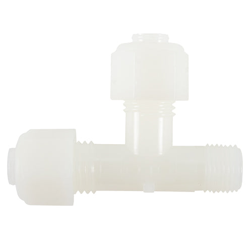 NYLO-Seal Nylon Male Run Tees have excellent resistance to acids, alkalis, dilute mineral acids, most organic acids, petroleum oils and greases, and photographic solutions. Installation time is reduced with NYLO-Seal fittings when compared to regular compression or flare fittings. Also, stress on the tubing is relieved during installation as the nut revolves around the sleeve as it is being tightened, which prevents torque from being transmitted to the tubing, to provide an excellent seal and ensures reliability. NYLO-Seal Nut & Sleeves are made of molded nylon to be strong and resistant to abuse, and the acetal copolymer sleeves provide maximum performance. They can continuously operate at temperatures of 200°F and intermittently at temperature as high as 250°F. NYLO-Seal fittings are excellent for instrument, lubricant, air, hydrocarbon fuel, oil coolant, low pressure hydraulic lines, laboratory, and chemical applications. This NYLO-Seal male run tee (EDMO# 271N06X06) fits 3/8-inch tubing and has a 3/8-inch pipe thread.