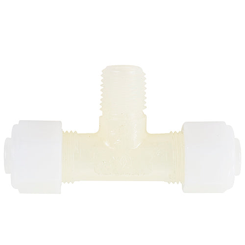 NYLO-Seal Nylon Male Branch Tees have excellent resistance to acids, alkalis, dilute mineral acids, most organic acids, petroleum oils and greases, and photographic solutions. Installation time is reduced with NYLO-Seal fittings when compared to regular compression or flare fittings. Also, stress on the tubing is relieved during installation as the nut revolves around the sleeve as it is being tightened, which prevents torque from being transmitted to the tubing, to provide an excellent seal and ensures reliability. NYLO-Seal Nut & Sleeves are made of molded nylon to be strong and resistant to abuse, and the acetal copolymer sleeves provide maximum performance. They can continuously operate at temperatures of 200°F and intermittently at temperature as high as 250°F. NYLO-Seal fittings are excellent for instrument, lubricant, air, hydrocarbon fuel, oil coolant, low pressure hydraulic lines, laboratory, and chemical applications. This NYLO-Seal male branch tee (EDMO# 272N06X06) fits 3/8-inch tubing and has a 3/8-inch pipe thread.