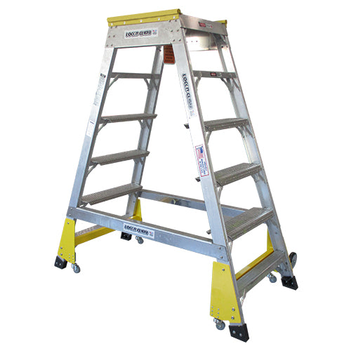 The Lock-N-Climb Ladder Safety System offers aircraft maintenance technicians a safe and secure platform for reaching the service points around corporate and commercial aircraft and helicopters. This ladder system is ideal for maintenance tasks such as inserting & removing GPU cables, serving components inside the wheel well area, checking static discharge ports and inspection panels, and other places during routine inspections. The design of these ladders have been optimized to place a technician in the optimum location of the aircraft, specific to the task at hand, to provide a safe and secure work environment for preventing accidents and injuries. Lock-N-Climb ladders meet OSHA and ANSI standards and are equipped with extra wide comfort treads and feature a patented 6061-grade aluminum base. Lock-N-Climb A-Frame safety ladders feature a large slip resistant top deck with spring loaded towing handles for easy maneuverability, and extra wide comfort treads allow technicians to stand securely for extended periods of time. The rubber padding prevents damage to the aircraft, and reflective tape offers improved visibility for enhanced safety. Available in 4, 6, 8, 10, and 12 foot heights. This Lock-N-climb A-Frame ladder (EDMO# 6LNCAFRAME) has a six-foot height.