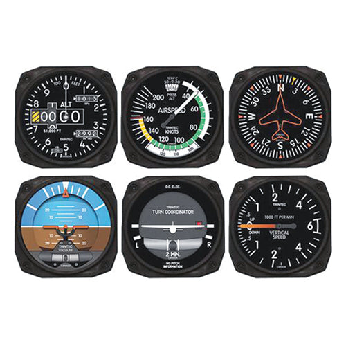 These modern instrument coasters are inspired to mimic the appearance of cockpit instruments, and are made of a tough polystyrene frame with a black rubber anti-skid base.