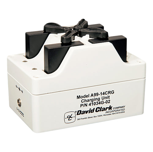 The digital intercom system Model A99-14CRG is a next generation four-bay battery charger that is specifically designed to charge 3.7V li-polymer batteries for David Clark's 9100 & 9900 series wireless belt stations. Each battery charges independently of the others. The batteries charge status is indicated by a multi-colored LED conveniently located next to its respective battery bay. This unit is capable of charging batteries in as little as three to four hours. Power cable options are available in a variety AC and DC configurations.