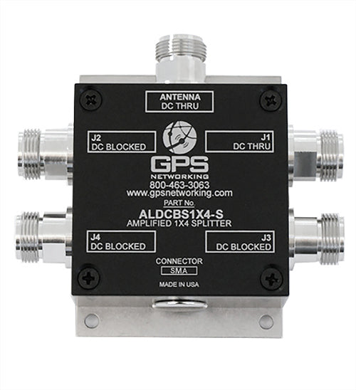 The ALDCBS1X4 GPS amplified splitter has one input and four outputs and is based on the Wilkinson splitter design. The frequency response covers the entire L-band (GNSS) frequencies with excellent gain flatness. In normal configuration, the RF output (J1) passes DC from a connected GPS receiver through the splitter and onto the antenna. This allows the GPS receiver to power both the antenna and the splitters internal amplifier. Each RF output (J2-J4) are DC blocked and incorporates a 200 resistor to simulate the antenna current draw preventing false antenna alarm faults.This ALDCBS1X4 GPS amplified splitter (EDMO# ALDCBS1X4S) includes one input and four outputs each with SMA connectors.