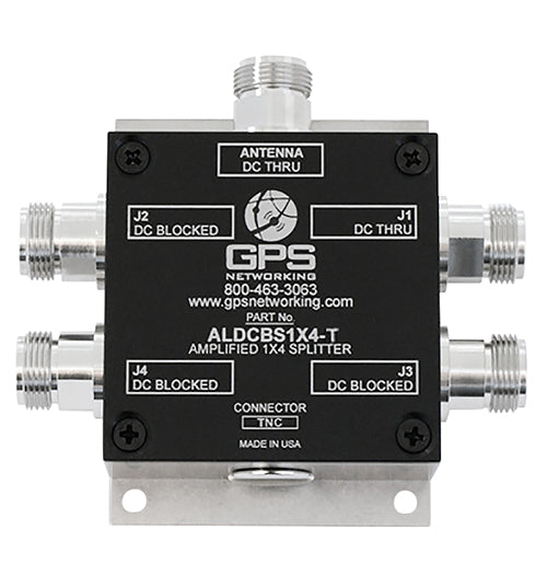 The ALDCBS1X4 GPS amplified splitter has one input and four outputs and is based on the Wilkinson splitter design. The frequency response covers the entire L-band (GNSS) frequencies with excellent gain flatness. In normal configuration, the RF output (J1) passes DC from a connected GPS receiver through the splitter and onto the antenna. This allows the GPS receiver to power both the antenna and the splitters internal amplifier. Each RF output (J2-J4) are DC blocked and incorporates a 200 resistor to simulate the antenna current draw preventing false antenna alarm faults.This ALDCBS1X4 GPS amplified splitter (EDMO# ALDCBS1X4T) includes one input and four outputs each with TNC connectors.