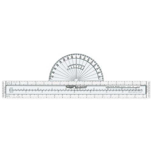 The CP-1 standard plotter is constructed of sturdy clear plastic with easy-to-read numbers and scales. It includes WAC, Sectional, and Terminal Area scales, and is checked and approved by the Weights and Measures Department. Quick scale reference is provided for both statute and nautical miles.