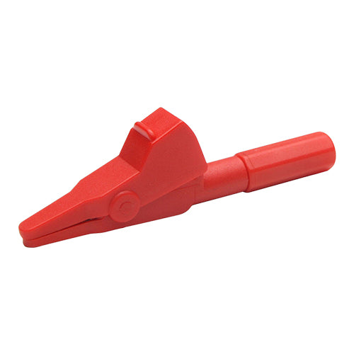 This fully insulated small safety alligator clip (EDMO# CTM-652-2) has a 4 mm safety banana jack. It accepts retractable, sheathed, and standard banana plugs, and the jaws open to 0.27 inches (7 mm).