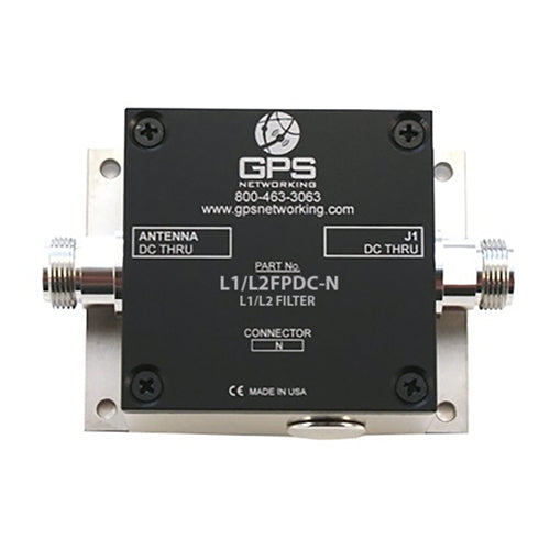 The L1/L2FPDC GPS band pass filter has one input and one output for providing addition filtering for the L1 and L2 frequency band. In normal configuration, the RF output (J1) passes DC from the connected GPS receiver through the input and onto the antenna, allowing the GPS receiver to power the antenna.