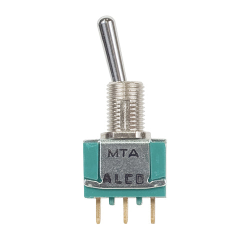 The Green Series Toggle Switches have silver slugs with all contact surfaces gold flashed, this inhibits oxidation and also offers a very low initial contact resistance. The design also includes overmolded terminals which eliminate any voids with epoxy sealed terminals. Version MTA-306E is a 3-pole, double-throw toggle switch. Positions: ON-OFF-ON