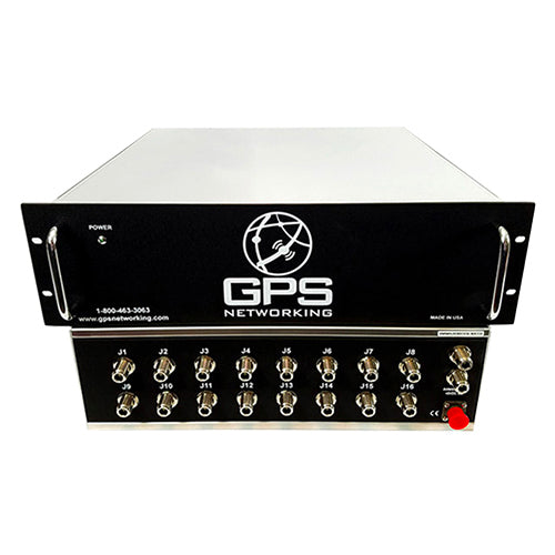 This rack mount amplified splitter features dual antenna inputs and 16 output ports that cover the L1 and L2 GPS frequency bands with excellent gain flatness. In the normal configuration, the splitter is powered by a receiver connector to J1 powering the splitter's amplifier and roof antenna. The output ports have a 200Ω load which simulates antenna draw to prevent antenna alarm faults. This dual antenna, 16-output unit is ideal where a GPS carrier signal is required by up to 16 GPS devices at once.This dual antenna, rack mount splitter (EDMO# DRMALDCBS2) features two inputs and 16 outputs, 48 VDC power option, and high isolation option.