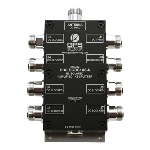 This Hi-Isolation amplified network loaded DC blocked GPS splitter features one input and eight outputs for spitting RF frequencies from 1.1 GHz — 1.7 GHz. It is designed to amplify and split the L-band frequency to multiple devices from a single antenna. In the standard configuration, the J1 port passes DC voltage from a connected device to the antenna or another device up from the splitter. The other ports J2—J8 is DC blocked and loaded with a 200Ω resistor to simulate antenna current draw which prevent alarm faults.This Hi-Isolations amplified GPS splitter (EDMO# NHIALDCBS) features one input and eight outputs, SMA-type female connectors, 5-volt output voltage, and 9-32 VDC [customer supplied] source voltage with MIL DC Connector (Includes Mate).