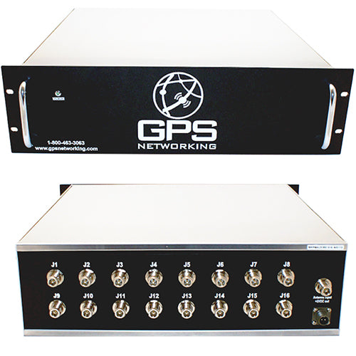This networked rack mounted amplified loaded DC blocked splitter features one input and sixteen outputs for splitting RF frequencies from 1.1 GHz — 1.7 GHz and fit in to a standard server rack. This GPS splitter is designed to amplify and split signals within the L-band spectrum to multiple devices from a single antenna. In the standard configuration, the J1 port passes DC voltage from a connected device to the antenna or anther device up from the splitter. The other ports (J2 — J16) are DC blocked and loaded with 200Ω resistors to simulate antenna current draw preventing antenna alarm faults.This networked amplified rack mounted GPS splitter (EDMO# NRMALDCBS) features one input and sixteen outputs, has N connectors, 5-volt output, and 110-volt source voltage.