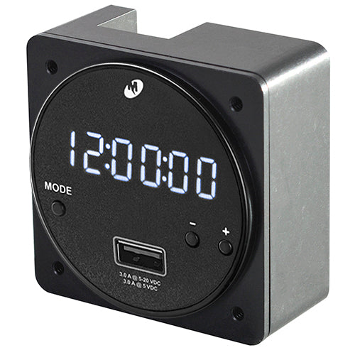 The CH93 series CHRONOS Digital Clocks are a multifunction clock which displays volts, temperature, time, countdown time, and stopwatch, and also comes available with multiple USB charging options. The CH93 installs in to a 2-1/4 inch avionics panel cutout and power is drawn from the aircraft main bus to power the unit. The white, seven-segment LED clock can displays several modes: local time, universal time, flight timers, elapsed and countdown timers and optionally, bus voltage and up to two temperature inputs. The daylight readable display features two methods of brightness controls: automatically using the internal photocell or manually with external dimming bus voltage. An internal battery maintains clock time and flight timer memory when the aircraft is not in use.This CH93 digital clock (EDMO# 6420093-3) features a single USB-A charging port, Local Time, UTC/Zulu Time, Flight Timer, Countdown Timer, Stopwatch, Volts, OAT, Secondary Air Temp.