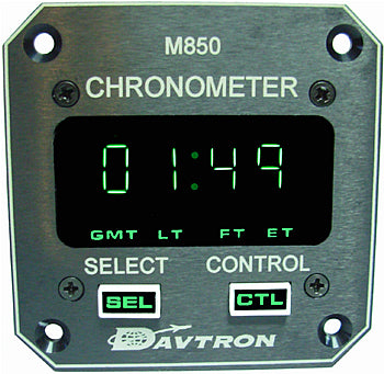 The M850 digital clock chronometer has a two-button control system, setting operations are identical for both alarm and time setting. The universal time is in a 24 hour format, while local time can be set to 12 or 24 hour format. The incandescent high-contrast display is readable in bright sunlight.Version (EDMO# 850-5VNVGW) has a 5V Wamco Green display that is night vision compatible. This is a 2-1/4 inch front panel mount instrument with 2 button control.