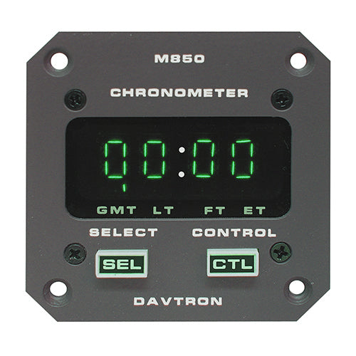 The M850 digital clock chronometer has a two-button control system, setting operations are identical for both alarm and time setting. The universal time is in a 24 hour format, while local time can be set to 12 or 24 hour format. The incandescent high-contrast display is readable in bright sunlight.Version 850A-28V-NVG has green A night vision compatible incandescent 28V lighting, gray faceplate, and N size alkaline battery memory. This is a 2-1/4 inch front panel mount instrument.