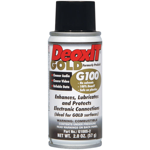 DeoxIT Gold G100 spray is a unique cleaner, condition, enhancer, lubricant and protectant for plated metal surfaces. It is improves conductivity, maintains optimum signal quality, reduces fretting and dendrite corrosion, and stabilizes connections between contacts. DeoxIT Gold coating reduces abrasion, arcing, RFI, intermittent connections, and improves connector performance and reliability. DeoxIT Gold is ideal for gold plated contacts pretreated with DeoxIT D-series contact cleaner.Part G100S-2 DeoxIT spay contains 2.0 oz (57 g) gold contact cleaner, enhancer and protector and includes a stainless steel extension tube.DeoxIT Gold G100L concentrate has approximately 0.5% chemical cleaning actionProvides excellent cleaning, deoxidizing, and protectionNo ozone depletionPrevents dendrite and fretting corrosionProtects base metalsReduces intermittent connections, arcing, RFI, wear and abrasionIdeal for both stationary and moving (vibration) connections