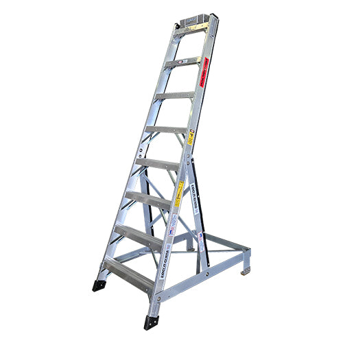 The Lock-N-Climb Ladder Safety System offers aircraft maintenance technicians a safe and secure platform for reaching the service points around corporate and commercial aircraft and helicopters. This ladder system is ideal for maintenance tasks such as inserting & removing GPU cables, serving components inside the wheel well area, checking static discharge ports and inspection panels, and other places during routine inspections. The design of these ladders has been optimized to place a technician in the optimum location of the aircraft, specific to the task at hand, to provide a safe and secure work environment for preventing accidents and injuries. Lock-N-Climb ladders meet OSHA and ANSI standards and are equipped with extra wide comfort treads and feature a patented 6061-grade aluminum base. Lock-N-Climb ergonomic safety ladders for helicopters are designed to provide maintenance technicians easy access the service points around helicopters. Pylon style ladders can be easily moved around the helicopter to perform various maintenance tasks while the Helicadet style ladder can be positioned over the skids of helicopters such as the Bell 429 or MD 530A.This Lock-N-climb Helicadet ladder (EDMO# 8HELICADET) has a eight-foot height for helicopters.